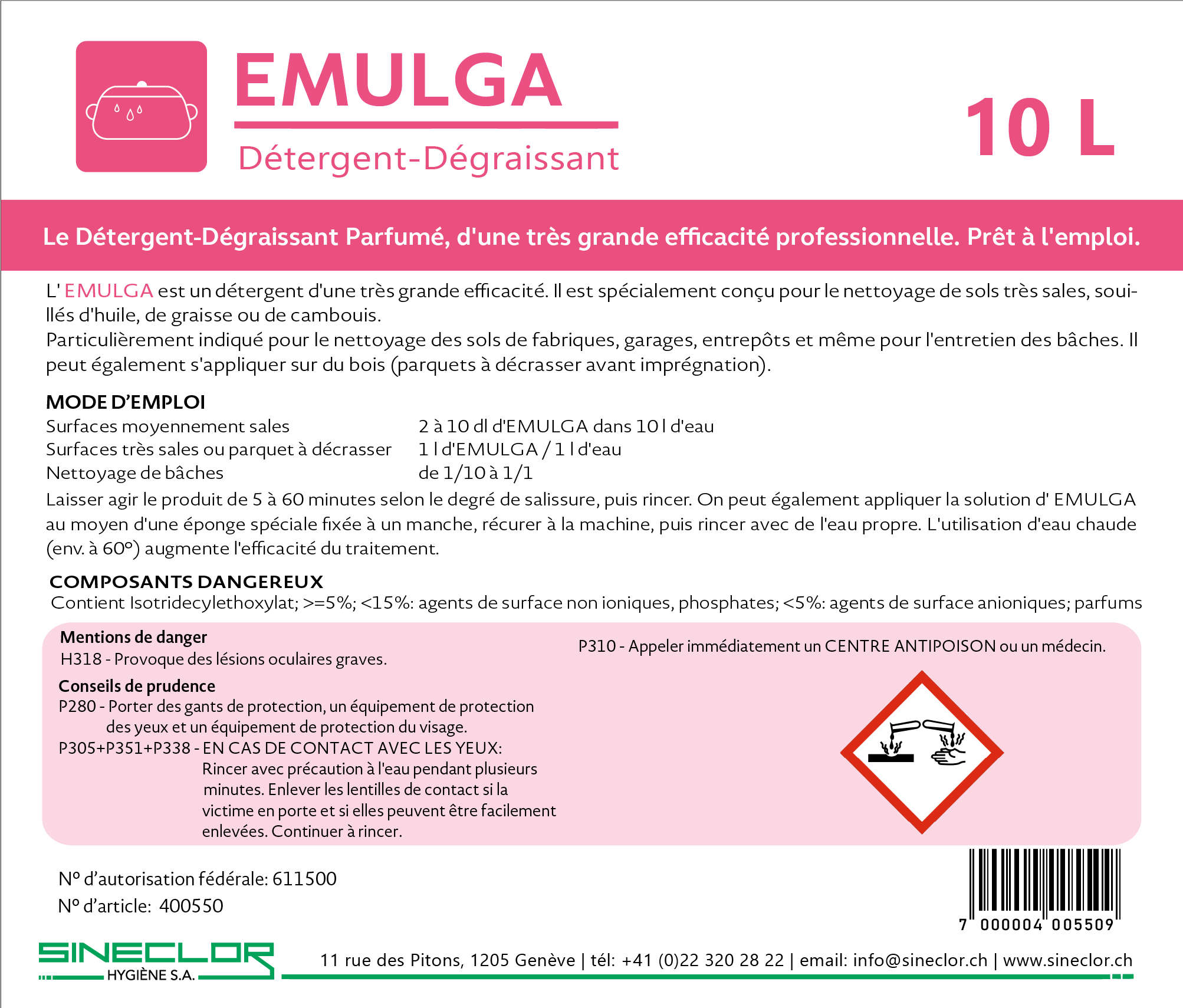 Ce qui distingue EMULGA est sa formule concentrée et sa triple action en tant que détergent, dégraissant et produit parfumé. Il présente une très grande efficacité professionnelle, permettant son utilisation aussi bien dilué pour l’entretien que pur pour décrasser les parquets ou traiter les salissures extrêmes. De plus, son rendement est significativement augmenté par l’utilisation d’eau chaude (env. 60°C), garantissant des résultats impeccables en un temps réduit.