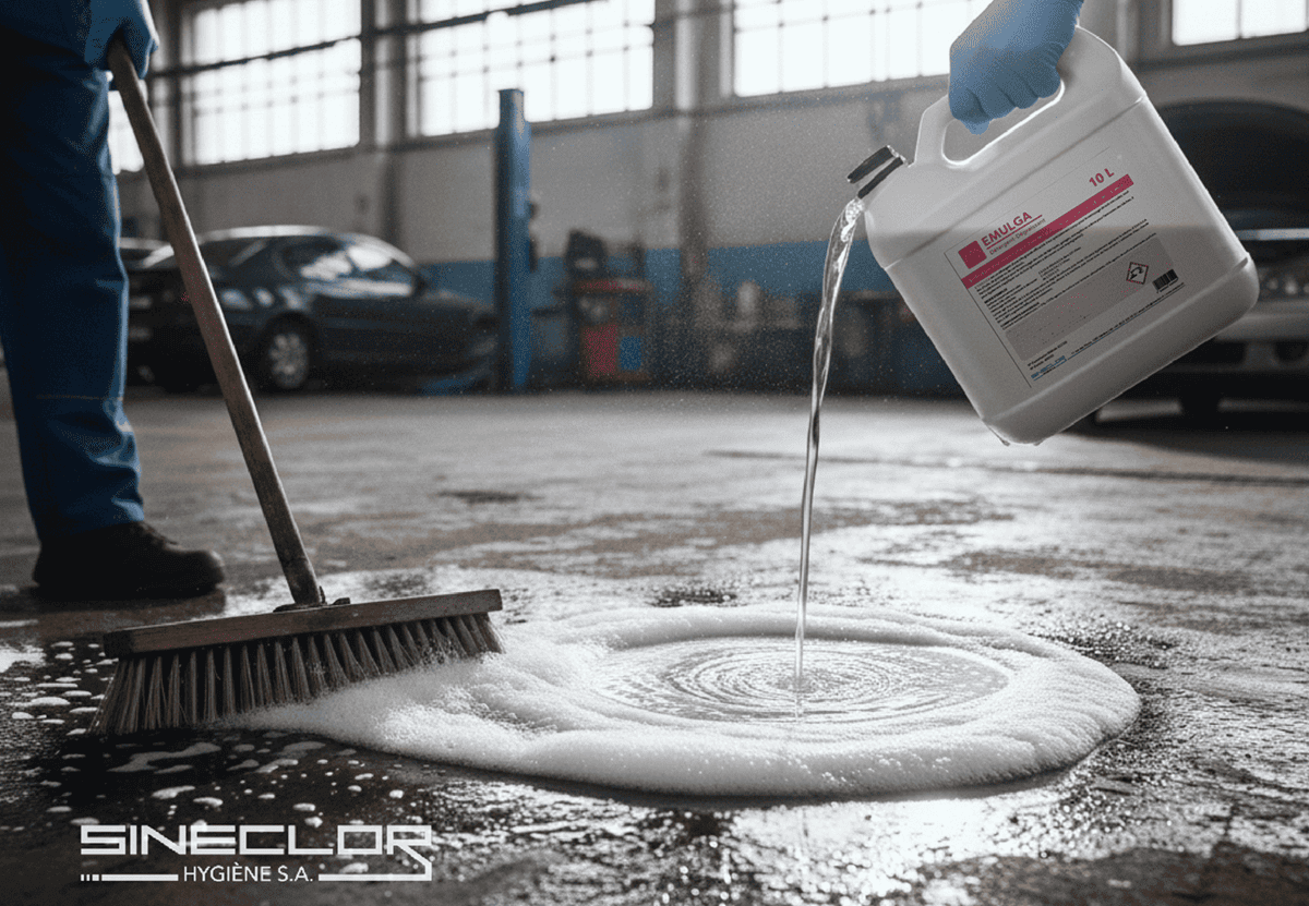 EMULGA est un Détergent-Dégraissant Parfumé d’une très grande efficacité, la solution définitive pour l’entretien du nettoyage intensif. Ce produit puissant est conçu pour attaquer les salissures les plus incrustées et résistantes. Sa fonction principale est l’émulsion et l’élimination rapide des taches les plus tenaces, telles que l’huile, les graisses animales et minérales, et le cambouis, assurant un nettoyage en profondeur qui va bien au-delà d’un détergent conventionnel.