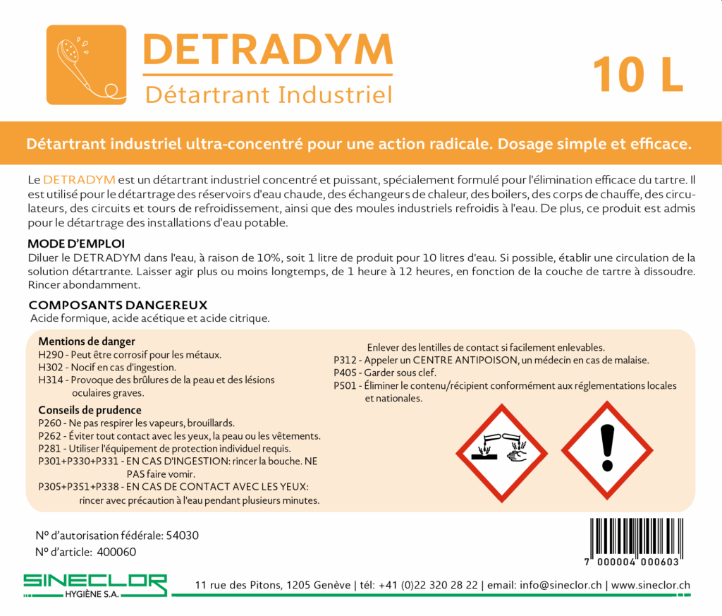 L’utilisation est simple : diluer DETRADYM à 10% dans l’eau et établir une circulation si possible. Le temps d’action est de 1 heure à 12 heures, selon l’incrustation. Un rinçage abondant est nécessaire après le traitement pour éliminer complètement les résidus.