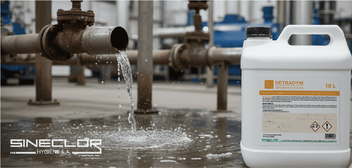 Le DETRADYM est un détartrant industriel ultra-concentré, formulé pour une action radicale et efficace contre le tartre et les incrustations calcaires les plus tenaces. Sa principale fonctionnalité est la dissolution rapide et totale de ces couches, rétablissant immédiatement le flux hydraulique et l’efficacité thermique de vos équipements. En assurant que les circuits fonctionnent sans obstruction, DETRADYM est l’outil essentiel pour maintenir des performances maximales et minimiser les temps d’arrêt.