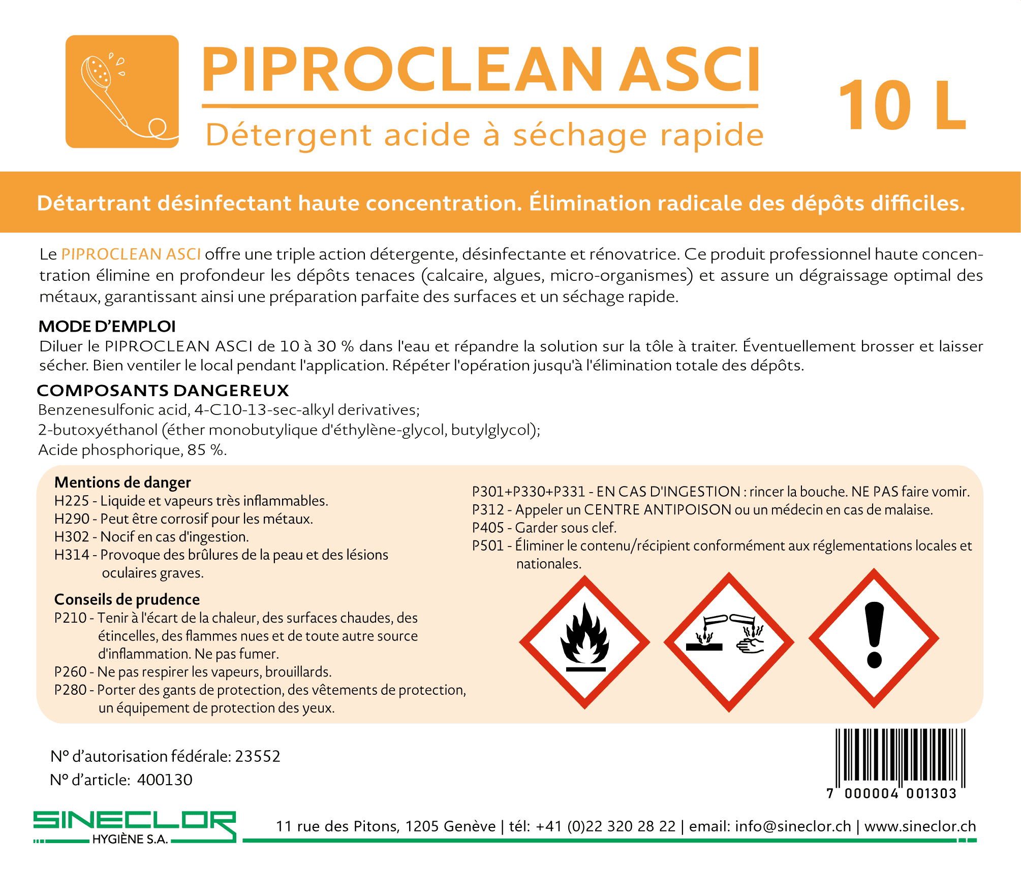 Le PIPROCLEAN ASCI est une solution professionnelle de haute performance conçue pour un nettoyage en profondeur doublé d’une action désinfectante radicale. Sa formule concentrée pénètre et dissout les dépôts les plus tenaces, éliminant efficacement le calcaire, le tartre, ainsi que les algues, champignons et bactéries pathogènes. C’est l’allié indispensable pour assurer une hygiène parfaite dans les environnements exigeants.