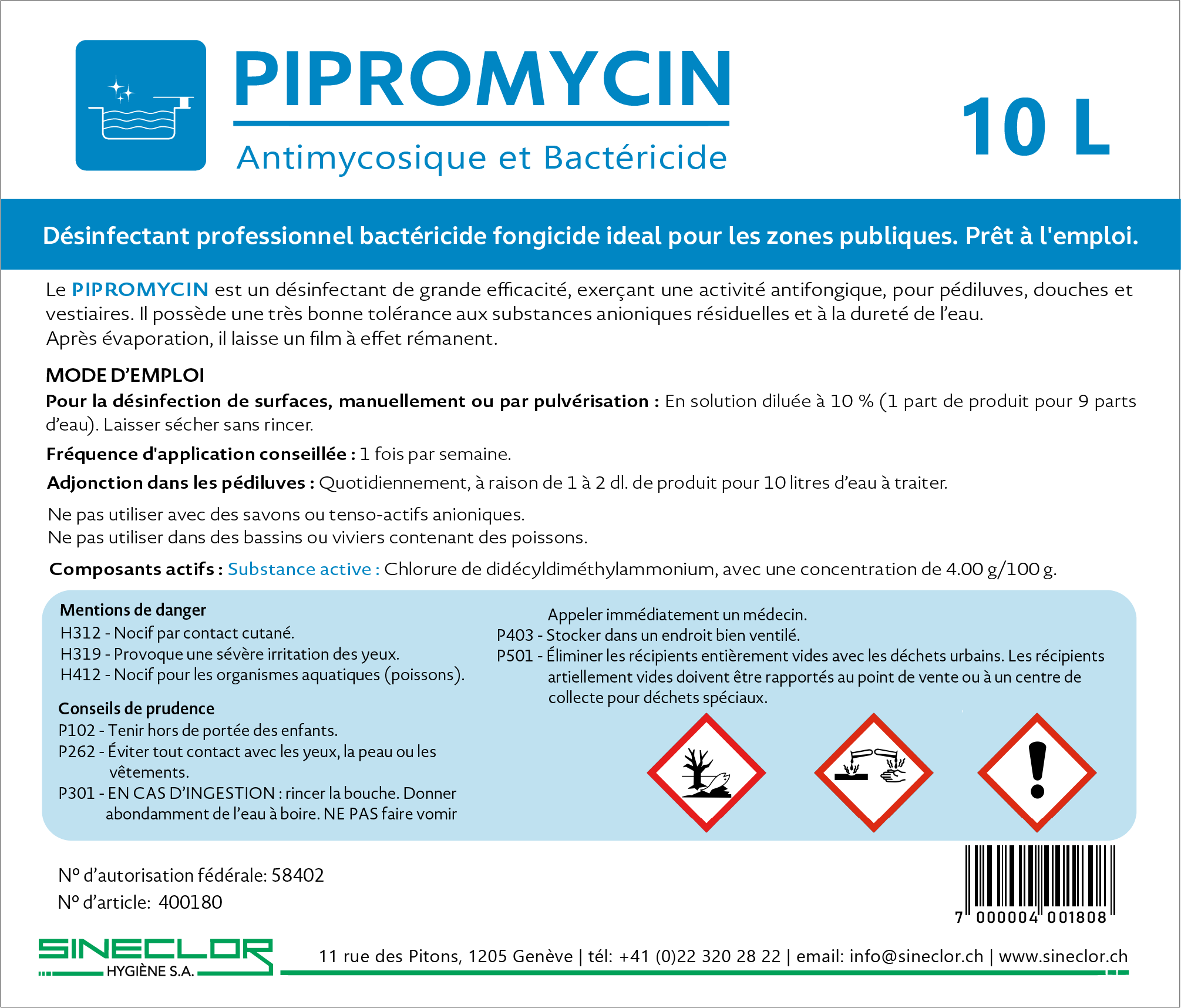 Le PIPROMYCIN est spécialement indiqué pour la désinfection des installations publiques et des zones à fort trafic, incluant les plages de piscines, les sols de douches et les salles de bain. Sa polyvalence s’étend également aux tapis en mousse et à l’adjonction dans les pédiluves des piscines, couvrant ainsi tous les points critiques.